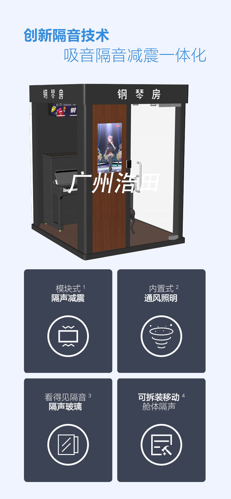 產(chǎn)品特點(diǎn):可以通過App和小程序?yàn)橛脩籼峁┒ㄎ伙@示,線上預(yù)約、掃碼開門、倉內(nèi)燈光、空調(diào)、凈化器自動啟動,自動記錄分析用戶的練琴數(shù)據(jù)并輸出建議指導(dǎo),用戶按使用時長自助結(jié)算,是一款很實(shí)用且便捷的自助智慧琴房,浩田自助琴房令充滿科技感.