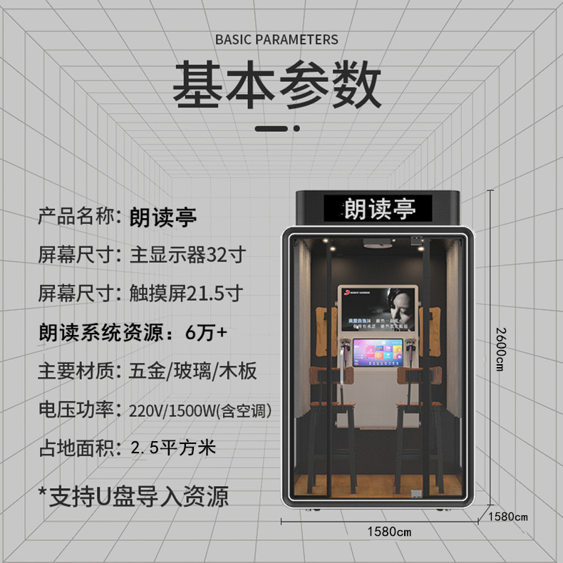產(chǎn)品特點:大型室內(nèi)朗讀亭尺寸158*158*266cm,可容納2~4人,專業(yè)用于:學(xué)校、圖書館、部隊、企業(yè)、單位等地方。朗讀+唱歌雙系統(tǒng)隨意切換,可U盤導(dǎo)入曲庫,后期免費更新朗讀素材以及歌曲,外觀裝有LED燈條,彰顯高端大氣,放置話筒的位置暖心設(shè)計了紫外線燈光系統(tǒng)。