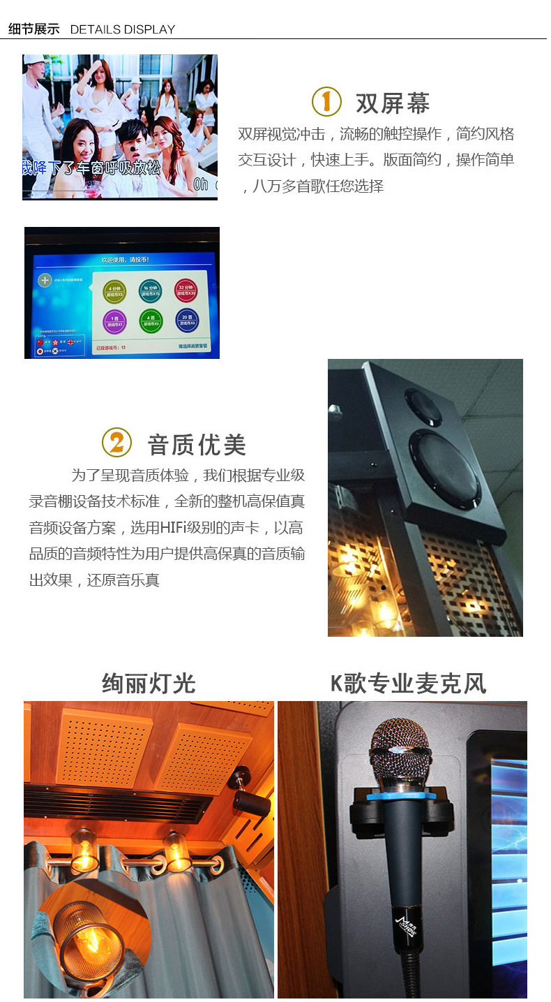 1.包廂式設計,美觀、時尚、大方,制作精美,裝飾豪華時尚,迷你KTV唱歌房(可添加朗讀功能),內部表面墻紙隔音膜采用韓國納米技術制造,隔音、環保、健康、舒適